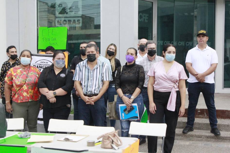 Comerciantes, líderes sociales y ciudadanos se manifestaron en el Centro de Atención a Clientes de la Comisión Federal de Electricidad para reclamar los daños que dejaron los apagones que se registraron durante las recientes lluvias.