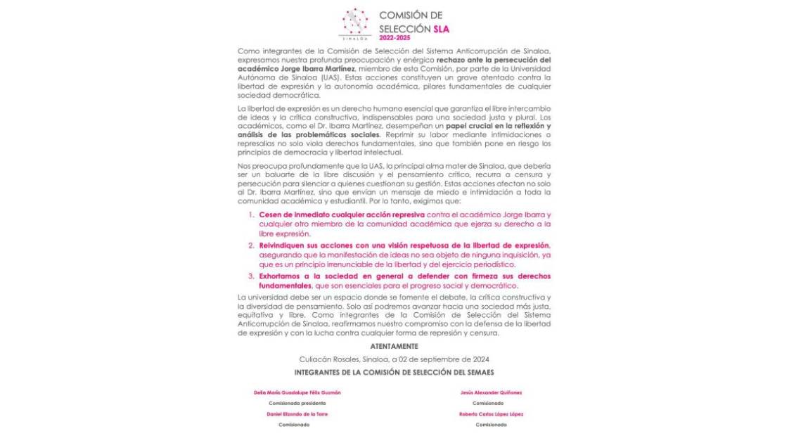 En el documento firmado por Delia María Félix Guzmán, presidenta del Comité de Selección, y los comisionados Daniel Elizondo de la Torre, Jesús Alexander Quiñónez, y Roberto Carlos López López, exigen el cese inmediato de cualquier acción represiva contra el académico Jorge Ibarra y cualquier otro integrante de la comunidad académica que ejerza su derecho a la libertad de ejerza su derecho a la libertad de expresión.