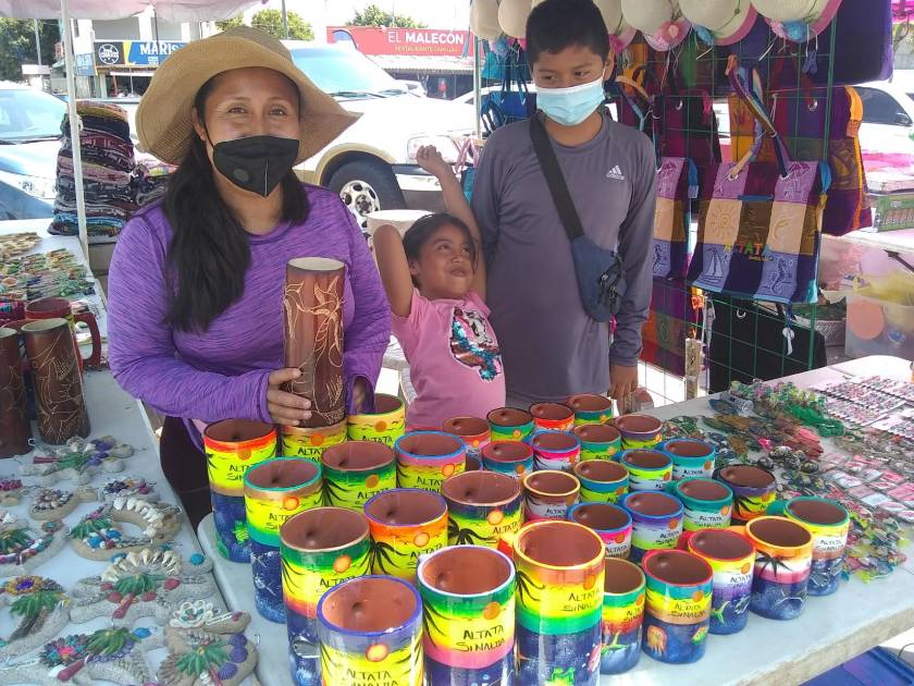 Son las diez de la mañana, y Ofelia Campos, una pequeña comerciante que radica en Altata, Navolato, prepara su puesto ubicado en el Malecón de este lugar, donde diariamente oferta sus productos, una amplia gama de artesanías, los cuales atraen la mirada de algunos turistas que desde tempranas horas visitan el lugar.