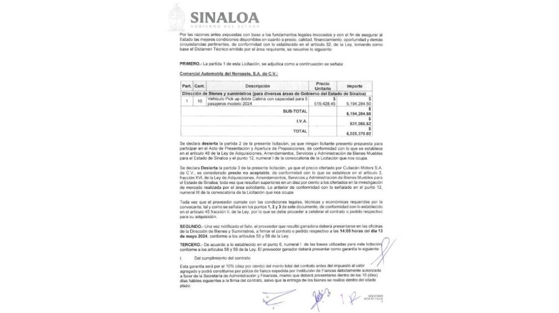 En la licitación resultó ganador del contrato el proveedor Comercial Automotriz del Noroeste, que cotizó cada unidad en 519 mil 428.45 pesos.