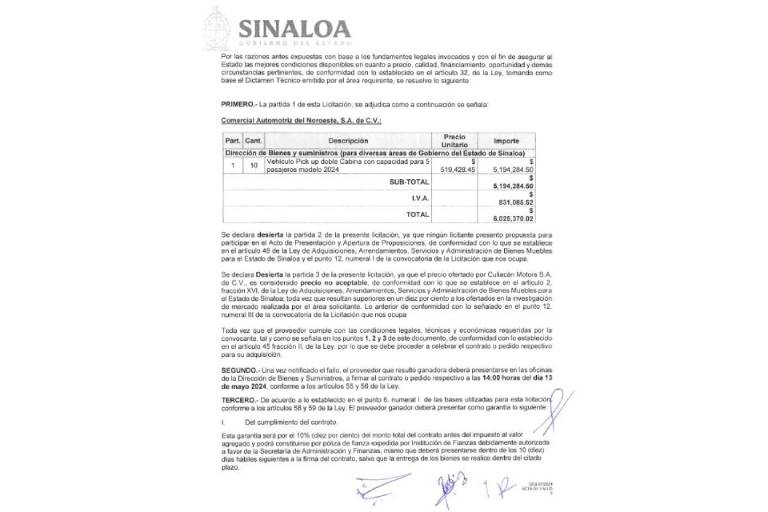 Este es el segundo procedimiento de compra de vehículos que emprende el Gobierno de Sinaloa durante 2024. El anterior concluyó en febrero, y fue para la adquisición de 30 unidades, 20 tipo sedán por 7.3 millones de pesos, y otros 10 vehículos SUV a razón de 4.9 millones.