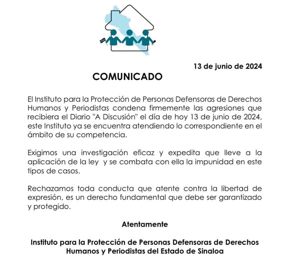 El Instituto para la Protección de Personas Defensoras de Derechos Humanos y Periodistas de Sinaloa se pronunció tras el atentado que sufrieron las instalaciones del medio de comunicación A Discusión durante la noche de este jueves.