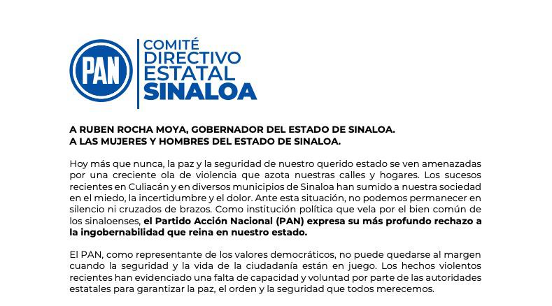 Por ello, el partido urgió a las autoridades que intervengan de manera efectiva para restaurar la paz en todo el estado, mayormente enfocado en Culiacán.
