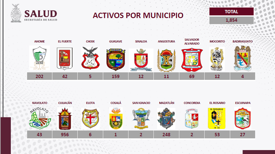 En total al momento hay mil 854 pacientes activos simultáneos en toda la entidad, los cuales en mayor medida se concentran en Culiacán con 956.