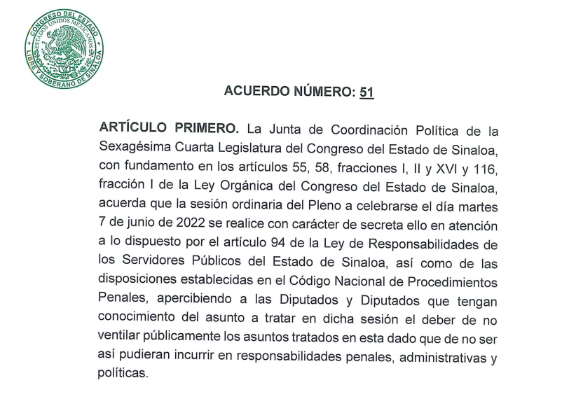 “Resultando así de aplicación para el asunto lo previsto en sus disposiciones sobre la secrecía de la investigación y desarrollo de las diferentes etapas, es que con fundamento en lo dispuesto en el Artículo 116, fracción 1 de la Ley Orgánica del Congreso del Estado de Sinaloa se determine la necesidad de que la sesión ordinaria programada a celebrarse el día martes 7 de junio de 2022 se celebre con el carácter de secreta”, se agrega.