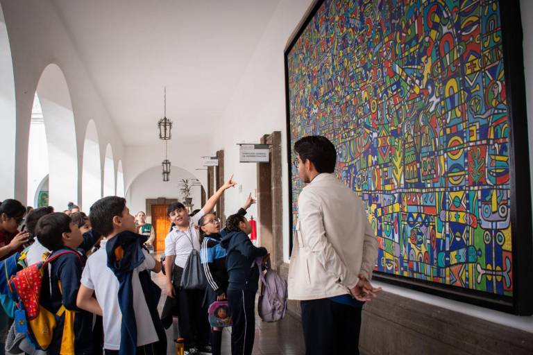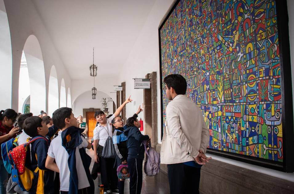 Durante el recorrido, los alumnos disfrutaron de la narración y descripción detallada de los murales que rodean el patio del edificio, los cuales representan aspectos de la historia, la identidad regional y la cotidianidad local.