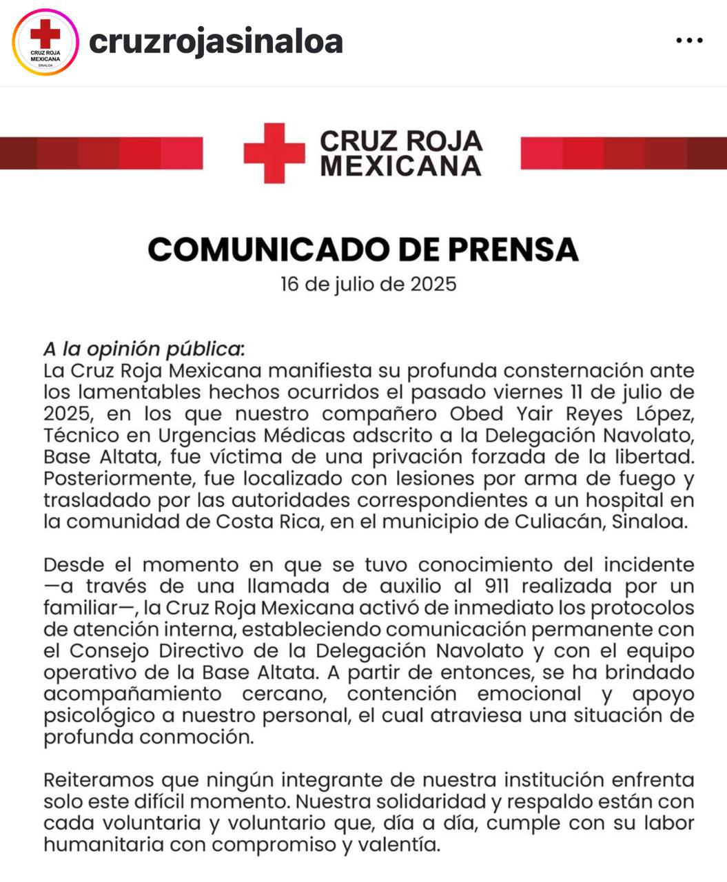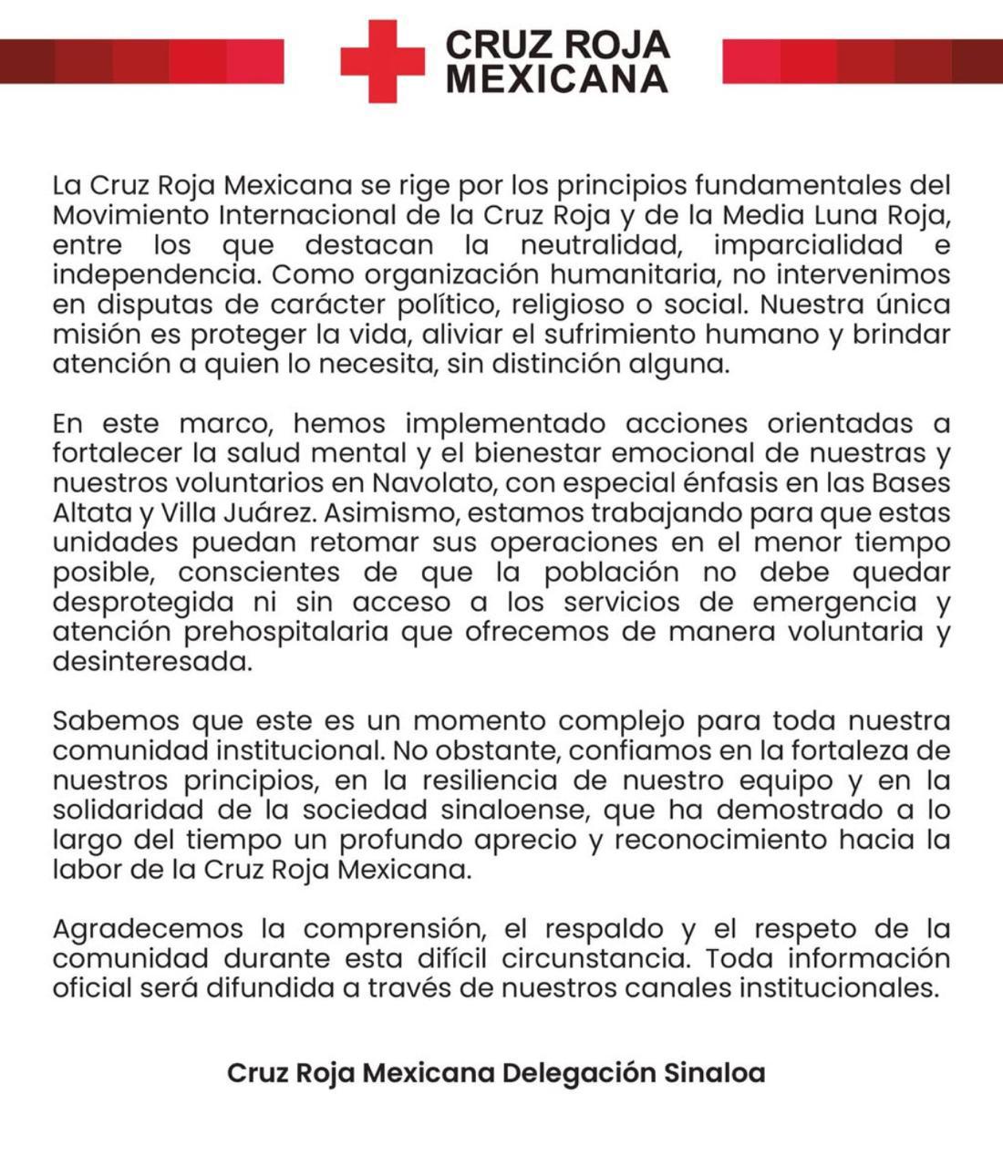 ”Sabemos que este es un momento complejo para toda nuestra comunidad institucional. No obstante, confiamos en la fortaleza de nuestros principios, en la resiliencia de nuestro equipo y en la solidaridad de la sociedad sinaloense, que ha demostrado a lo largo del tiempo un profundo aprecio y reconocimiento hacia la labor de la Cruz Roja Mexicana”.