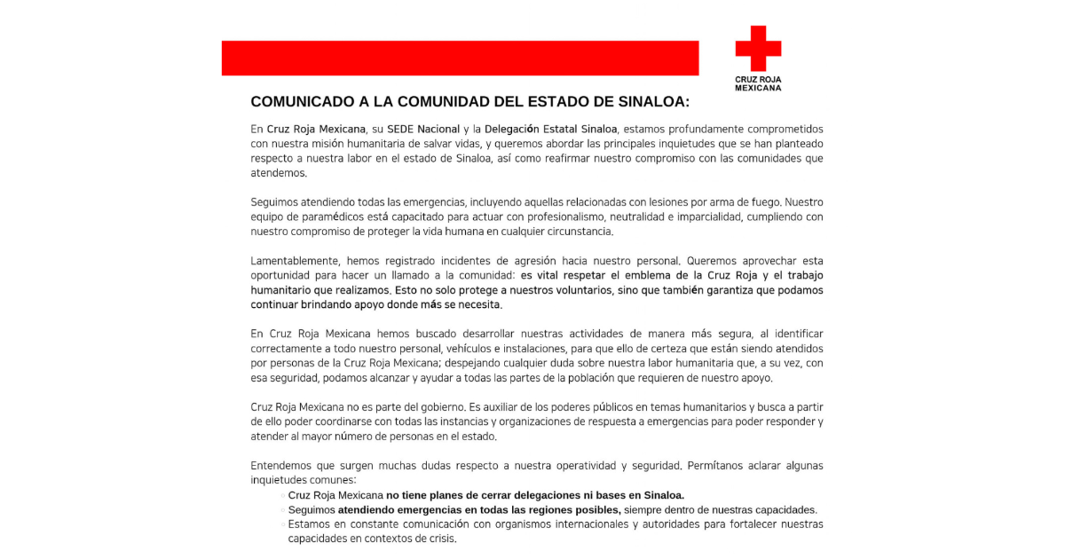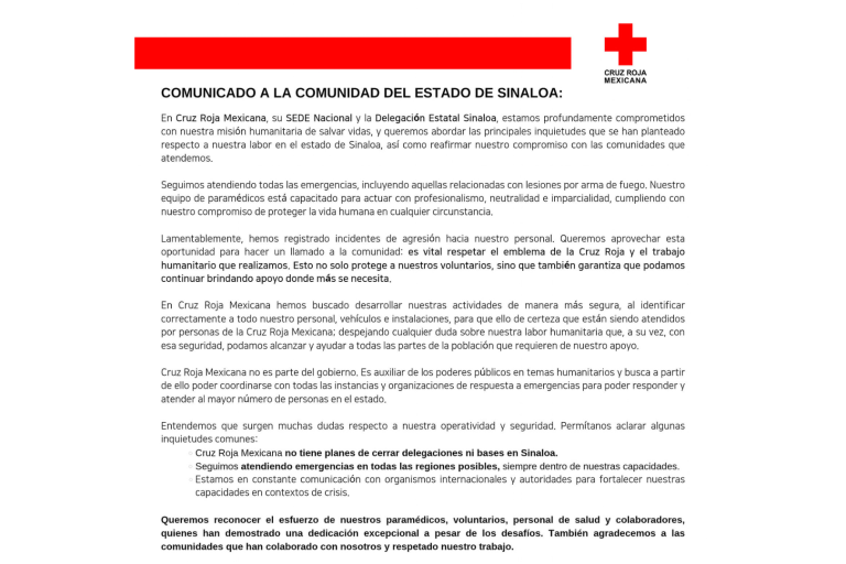 También detalla que el equipo de paramédicos de Cruz Roja en Sinaloa está capacitado para actuar con profesionalismo, neutralidad e imparcialidad, y que cumplirán con su compromiso de proteger la vida humana en cualquier circunstancia.