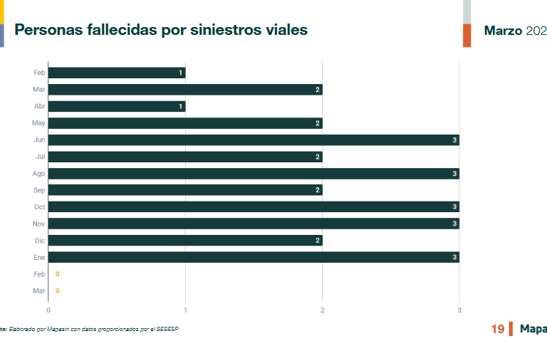 Respecto a personas lesionadas, marzo cerró con 98 personas heridas derivadas de 76 siniestros viales, una cifra menor pese a que el total de accidentes se mantiene en niveles similares.