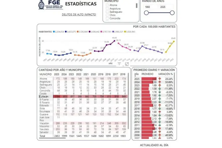 Este 2025, los municipios de Culiacán, Mazatlán y Navolato concentran la mayor parte de los delitos de alto impacto registrados en Sinaloa, de acuerdo con las estadísticas de la Fiscalía General del Estado, actualizadas al corte de noviembre.