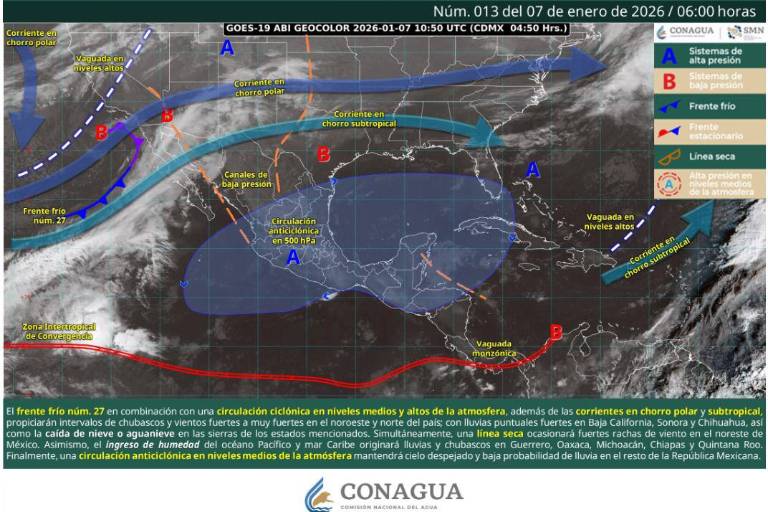De acuerdo con el Servicio Meteorológico Nacional, el panorama estatal es influenciado por el frente frío número 27, el cual interactúa con una circulación ciclónica y las corrientes en chorro polar y subtropical.