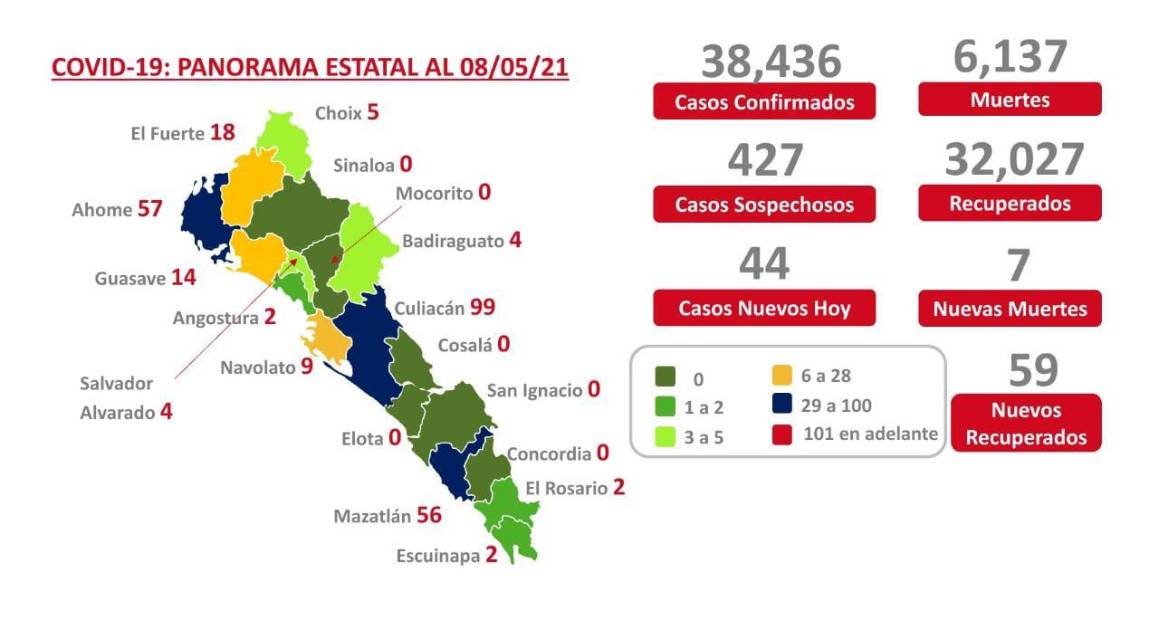 Además se presentaron 44 pacientes nuevos que se confirmaron en Culiacán con 19, Ahome con 16, Mazatlán con 4, El Fuerte con 3 y Navolato con 2.