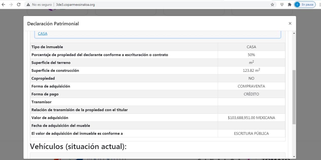 De acuerdo a la página 3de3.coparmexsinaloa.org, que muestra información sobre los distintos candidatos que están buscando algún cargo público en las elecciones del 6 de junio, el candidato a la Gubernatura por el Partido Verde Ecologista, Tomás Saucedo Carreño, en su declaración patrimonial registró una casa de un costo de 103 millones 688 mil 951 pesos.