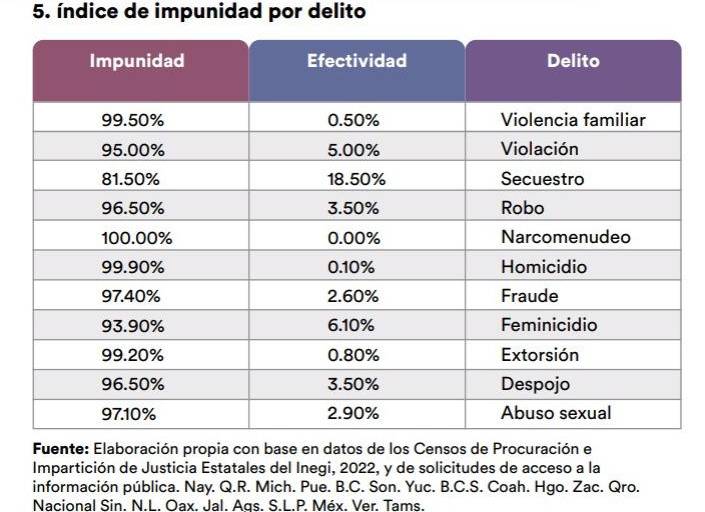 Además de 99.5 por ciento en violencia familiar, 97.1 por ciento en abuso sexual, 96.5 por ciento en despojo, 97.4 por ciento en delito de fraude, 96.5 por ciento en el delito de robo simple, y en el delito de narcomenudeo la impunidad es del 100 por ciento.
