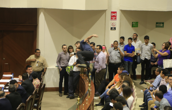 Antes de iniciar la sesión un grupo de ciudadanos acordó brincar hacia el área de los diputados y ponerles maíz. La acción no se concretó porque no contaron con la rapidez con la que actuó el agente de seguridad.