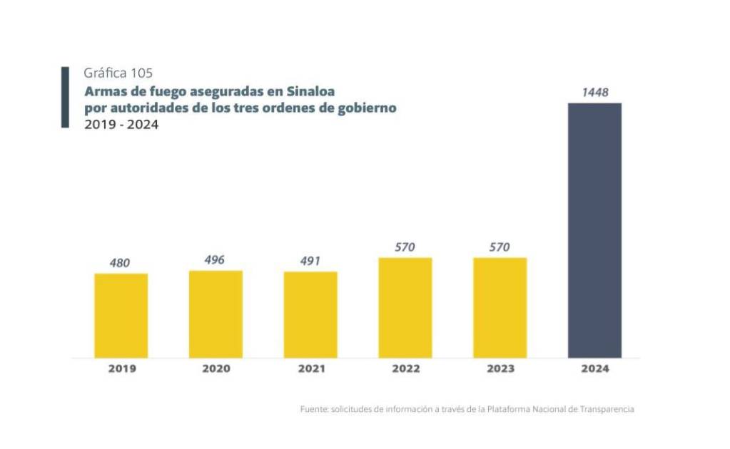 De acuerdo con el Estudio sobre Seguridad y Justicia en el Estado de Sinaloa, Diagnóstico 2024, elaborado por la Coordinación General del Consejo Estatal de Seguridad Pública, el año pasado se decomisaron mil 448 armas, una cifra tres veces mayor a la registrada en los últimos cinco años.