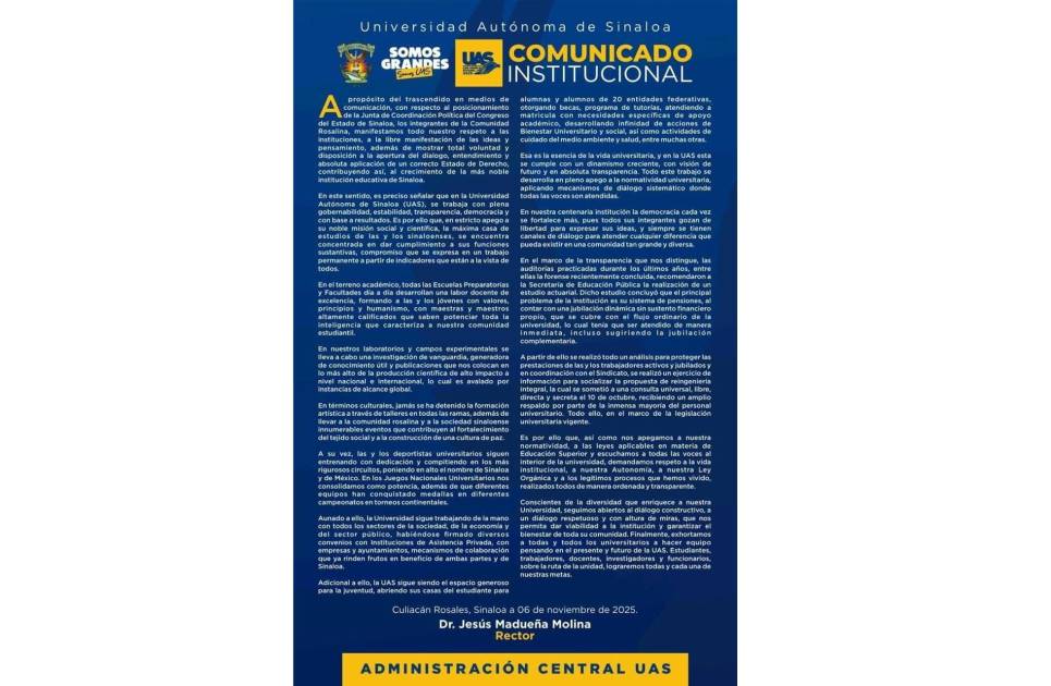 En un comunicado institucional compartido este jueves, la administración encabezada por el Rector Jesús Madueña Molina expresó su respeto hacia las instituciones y reiteró su compromiso con el diálogo, la democracia y la estabilidad universitaria.
