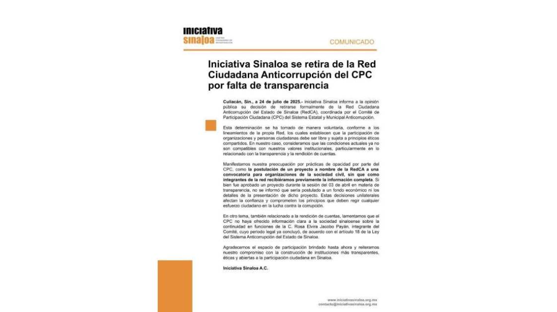“Iniciativa Sinaloa informa a la opinión pública su decisión de retirarse formalmente de la Red Ciudadana Anticorrupción del Estado de Sinaloa (RedCA), coordinada por el Comité de Participación Ciudadana (CPC) del Sistema Estatal y Municipal Anticorrupción”, anuncia.