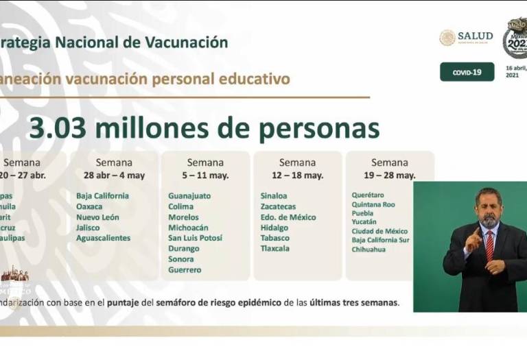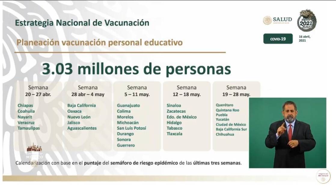 De acuerdo a la calendarización presentada por autoridades federales, la vacunación contra el Covid-19 a maestros y personal educativo dará arrancará primeramente en Chiapas, Coahuila, Nayarit, Veracruz y Tamaulipas, cinco de las ocho entidades en verde en el Semáforo Epidemiológico, del 20 al 27 de abril.