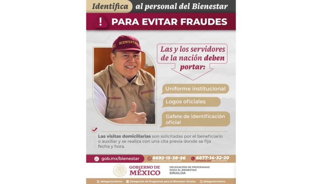 La Delegación de los Programas para el Bienestar en Sinaloa llamó a los beneficiarios de programas sociales a identificar las características que corresponden a las y los Servidores de la Nación, ante robos registrados en el municipio de Escuinapa.