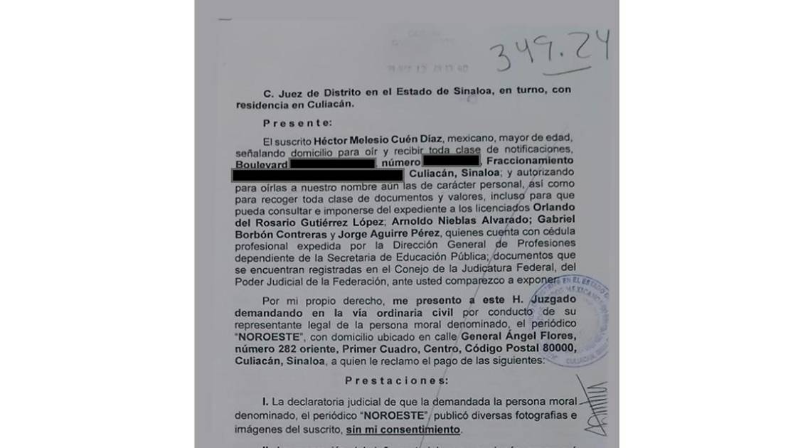 Según el hijo del ex Rector de la Universidad Autónoma de Sinaloa, Héctor Melesio Cuén Ojeda, asesinado durante la reunión en que fue raptado Ismael “El Mayo” Zambada el 25 de julio de 2024, Noroeste publicó diversas notas periodísticas que incluyeron fotografías suyas. “...utilizó mi imagen sin mi permiso o autorización”, dice la denuncia.