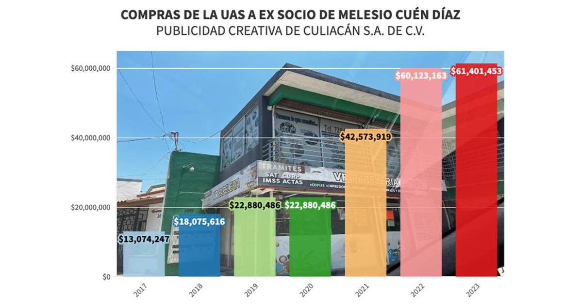 De acuerdo con las mil 647 facturas contabilizadas y revisadas por Noroeste, Publicidad Creativa de Culiacán le facturó de febrero de 2017 a mayo de 2021 la cantidad de 25 millones 554 mil 694 pesos a la Universidad; pero a partir de que Jesús Madueña Molina asumió la Rectoría y Héctor Melesio Cuén Díaz la Dirección de Bienes e Inventarios, la facturación de este proveedor se incrementó de manera sustancial hasta alcanzar los 61 millones 401 mil 453 pesos en total en abril de 2023.