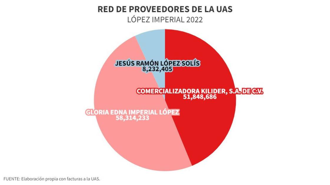 La red está integrada por dos personas físicas con actividad empresarial casadas entre sí: Gloria Edna Imperial López y Jesús Ramón López Solís, y una persona moral de la que éste último es socio: Comercializadora Kilider S.A. de C.V. Entre las tres razones sociales, facturaron a la UAS a tasas de 10.7 millones de pesos mensuales en promedio de febrero a diciembre de 2022.