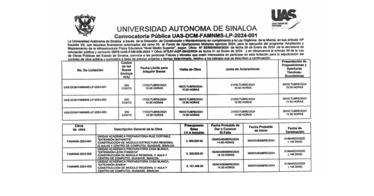 La Universidad Autónoma de Sinaloa lanzó una convocatoria pública para la construcción de aulas y módulos de cómputo en tres unidades académicas de Guasave para la cual destinarán 11 millones 561 mil 406 pesos.