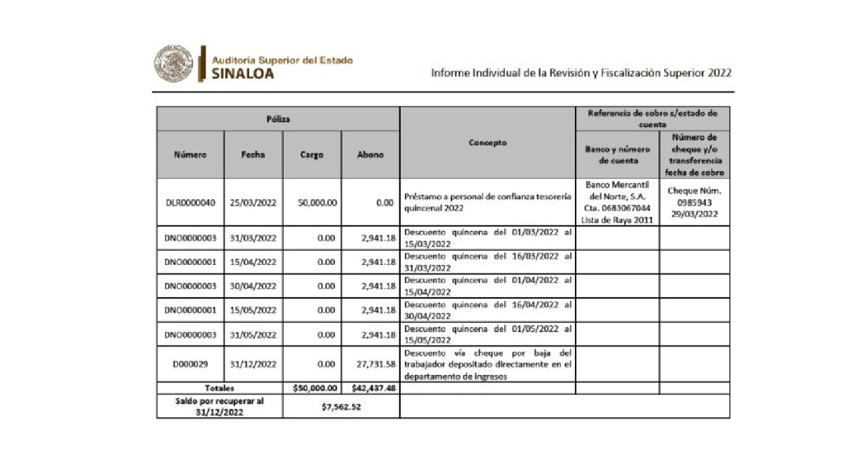 La Auditoría Superior del Estado de Sinaloa emitió pliegos de observaciones al Ayuntamiento de Culiacán por la detección de 65 mil pesos en préstamos a dos trabajadores sindicalizados y uno de confianza durante el ejercicio fiscal 2022.