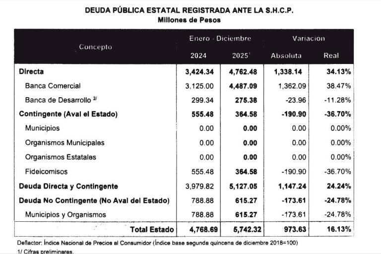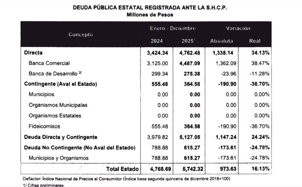 Al cierre de 2025, el saldo total de la deuda del estado se ubicó en 5 mil 742.32 millones de pesos, frente a los 4 mil 768.69 millones registrados en 2024, lo que representó un aumento absoluto de 973.63 millones de pesos y una variación real de 16.13 por ciento.