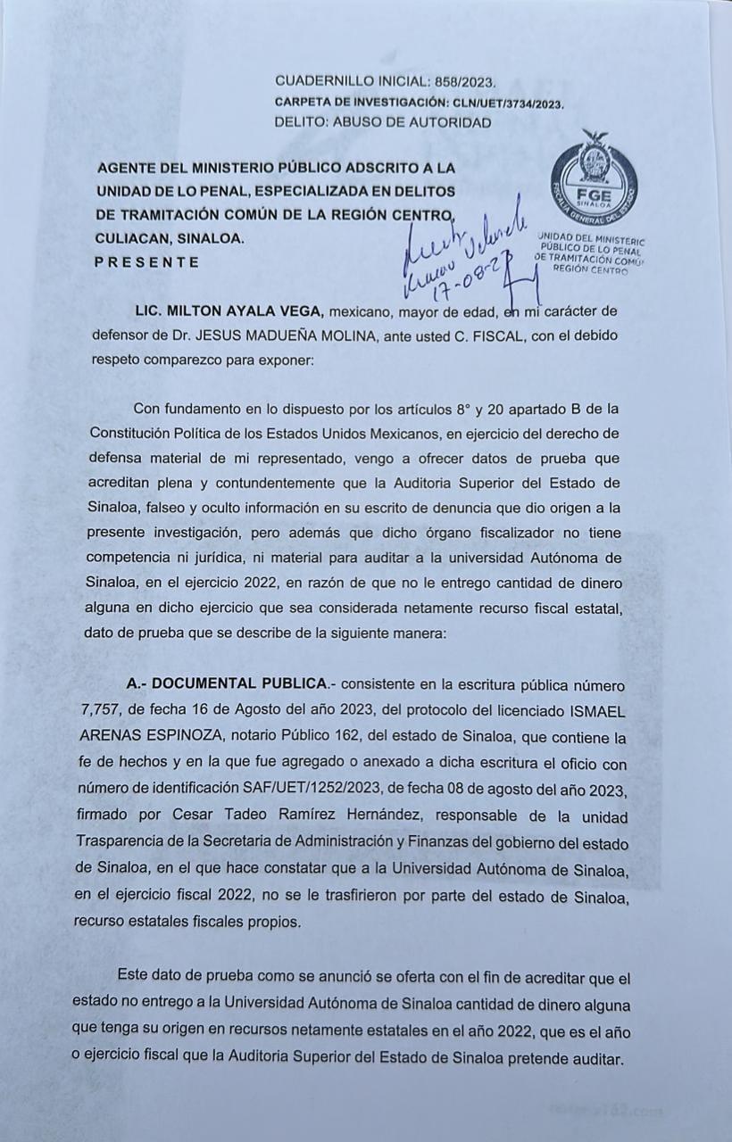 Teniendo como documento comprobatorio una solicitud de acceso a la información, Ayala Vega presentó ante la Fiscalía General de Sinaloa los documentos que señalan que el Gobierno del Estado no dotó de recursos a la UAS en 2022. La presentación de estos documentos fue con la intención de que la FGE invalide el proceso penal en contra del Rector Jesús Madueña Molina y del abogado general de la UAS Robespierre Lizárraga Otero, en el que se les acusa de abuso de autoridad a resistirse a una auditoría estatal.