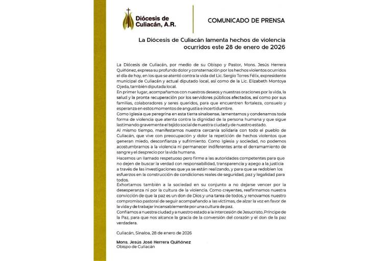 “Al mismo tiempo, manifestamos nuestra cercanía solidaria con todo el pueblo de Culiacán, que vive con preocupación y dolor la repetición de hechos violentos que generan miedo, desconfianza y sufrimiento. Como Iglesia y sociedad, no podemos acostumbrarnos a la violencia ni permanecer indiferentes ante el derramamiento de sangre y el desprecio por la vida humana”, señala el documento.
