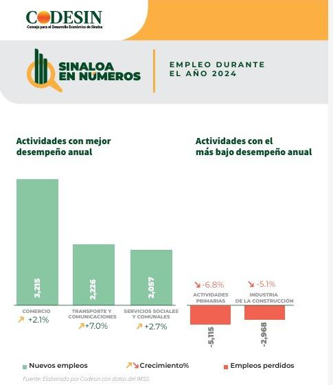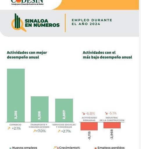 El reporte de Codesin, indica que a nivel general, el empleo en Sinaloa mostró un crecimiento del 0.1 por ciento en comparación con el año anterior, pasando de 601 mil 359 trabajadores en 2023 a 601 mil 686 en 2024.