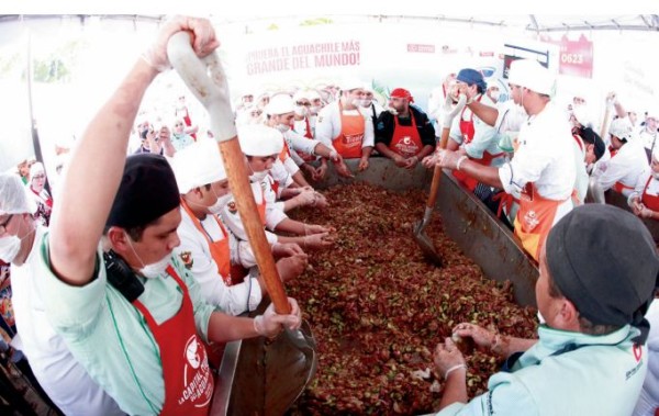 Para la preparación, explicó el chef Miguel Taniyama, se requirió de una tonelada 300 kilos de camarón, una tonelada de pepino que se peló y quitó semilla, lo que lo dejó en 600 kilos aproximadamente, 500 kilos de cebolla morada, alrededor de 240 litros de salsa y dos toneladas de limón.