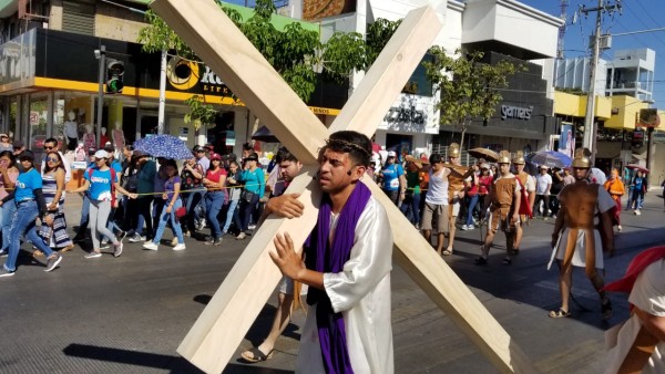 En Culiacán el viacrucis estelar se realiza en la Álvaro Obregón, la principal arteria de la ciudad, conectando dos templos icónicos para los católicos: inicia en la Catedral a las 9:00 horas y concluye en la Lomita. Unos 80 jóvenes en su mayoría, sin tablas en la actuación, son los protagonistas detrás de un esfuerzo titánico de reuniones y ensayos previos.