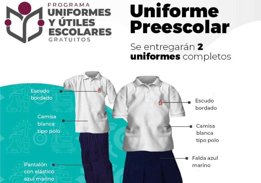Para preescolar se entregarán dos juegos completos de uniformes escolares que constan de camisa blanca tipo polo con escudo bordado y pantalón o falda azul marino. Cabe destacar que para el nivel preescolar el Gobierno del Estado licitó la compra de 91 mil pares de tenis escolares, por lo que se espera que en los próximos días se anuncie el protocolo para el canje de los mismos.