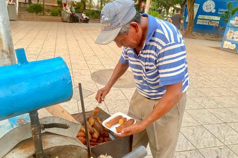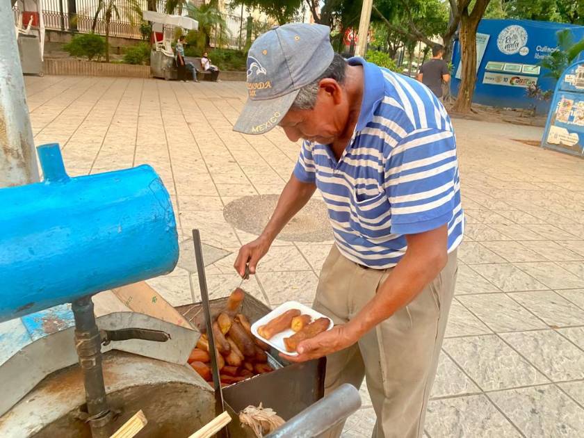 Emilio es originario de Oaxaca y llegó a Culiacán desde hace casi medio siglo, relata que cuando conoció este oficio le gustó tanto que quedó maravillado y decidió dedicar su vida a preparar camote y plátano cocido recorriendo las calles del centro histórico vendiendo este dulce típico manteniendo viva la tradición.