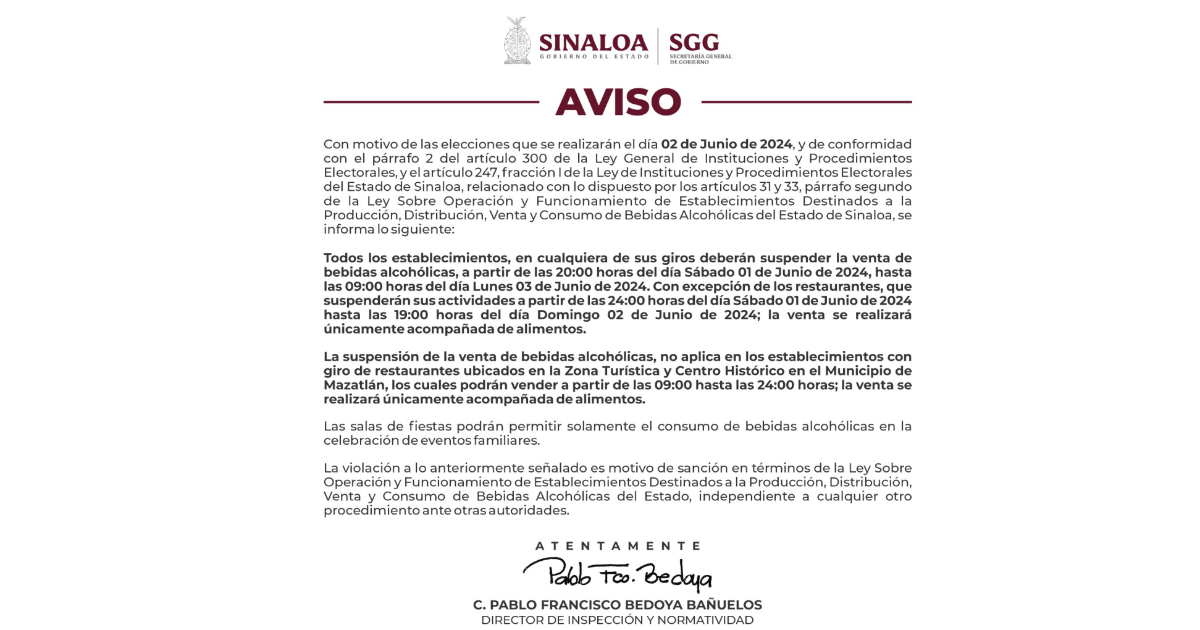 A partir de las 20:00 horas del sábado 1 de junio se suspenderá la venta de bebidas alcohólicas por la jornada electoral que se llevará a cabo el 2 de junio, informó Pablo Francisco Bedoya Bañuelos, Director de Inspección y Normatividad de la Secretaría General de Gobierno.