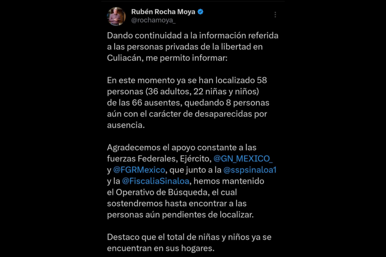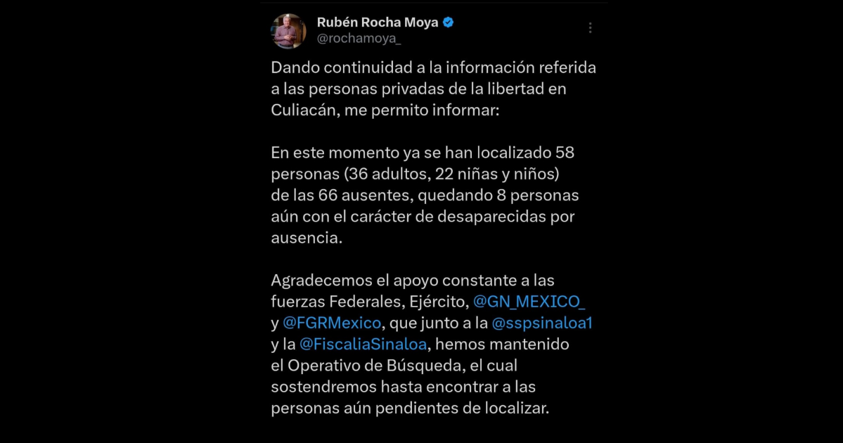 “En este momento ya se han localizado 58 personas (36 adultos, 22 niñas y niños) de las 66 ausentes, quedando 8 personas aún con el carácter de desaparecidas por ausencia”, publicó el Gobernador Rubén Rocha Moya mediante una publicación en redes sociales.