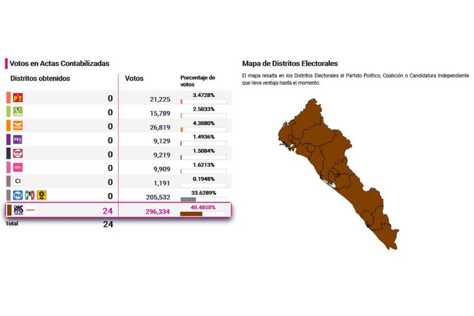 La 64 Legislatura se perfiló como morenista, siendo las candidaturas comunes de Morena y el PAS las que llevan ventaja en los 24 distritos electorales.