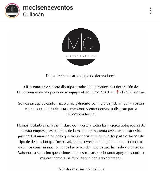 A través de un comunicado, la empresa MC Diseña Eventos ofreció disculpas por la inadecuada decoración de Halloween que se realizó por su equipo en una fiesta efectuada el pasado 29 de octubre en Culiacán.