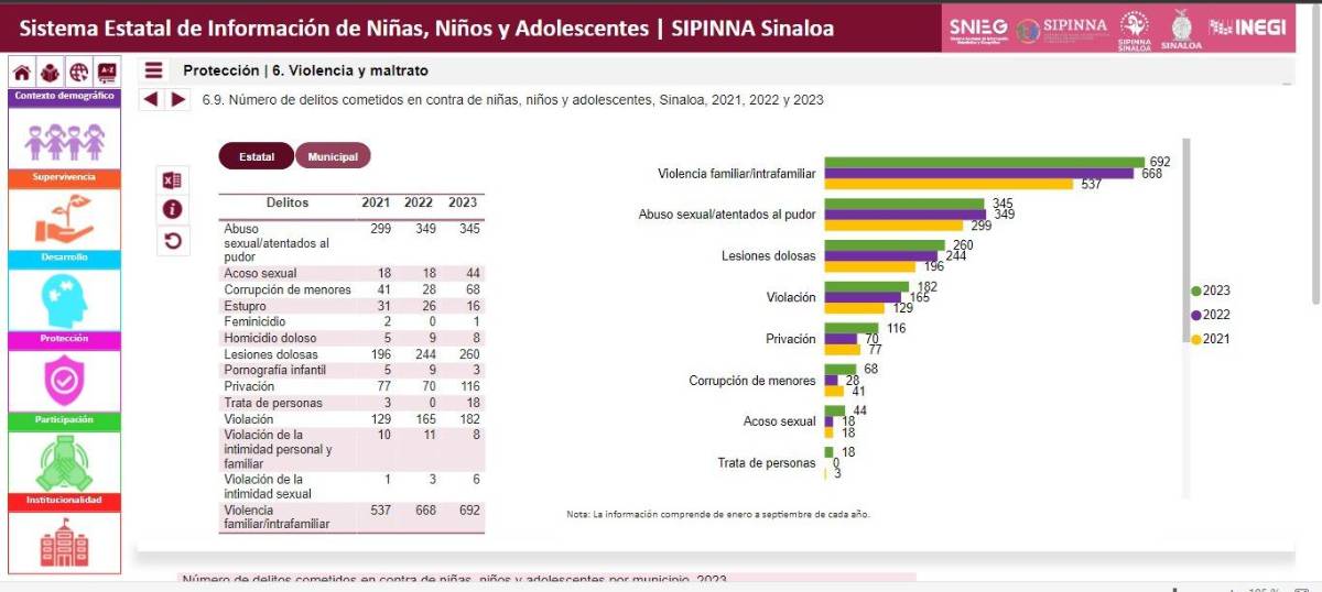 De acuerdo a la información estadística de Sipinna Sinaloa, los principales delitos incluyen la violencia intrafamiliar, el abuso sexual, la violación, lesiones dolosas, la privación, corrupción de menores, acoso sexual y la trata de personas.