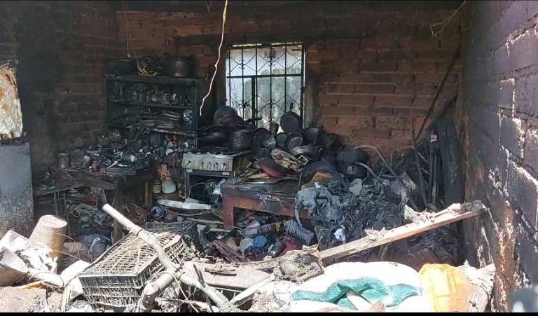 En el piso hay basura, hay restos de madera quemada, alambras que sobresalen, pero también ropa, cobertores, el esqueleto de alambre de los colchones, de sillones y roperos, y al fondo lo peor: la estufa derretida y decenas de cacerolas, sartenes y demás loza quemada y pintada por el hollín.