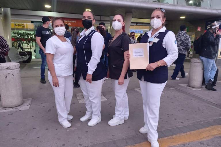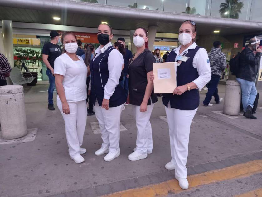 Un grupo de enfermeras uniformadas se encontraban flanqueando la salida del edificio, una de ellas con carpeta en mano que pretendía entregar a López Obrador.