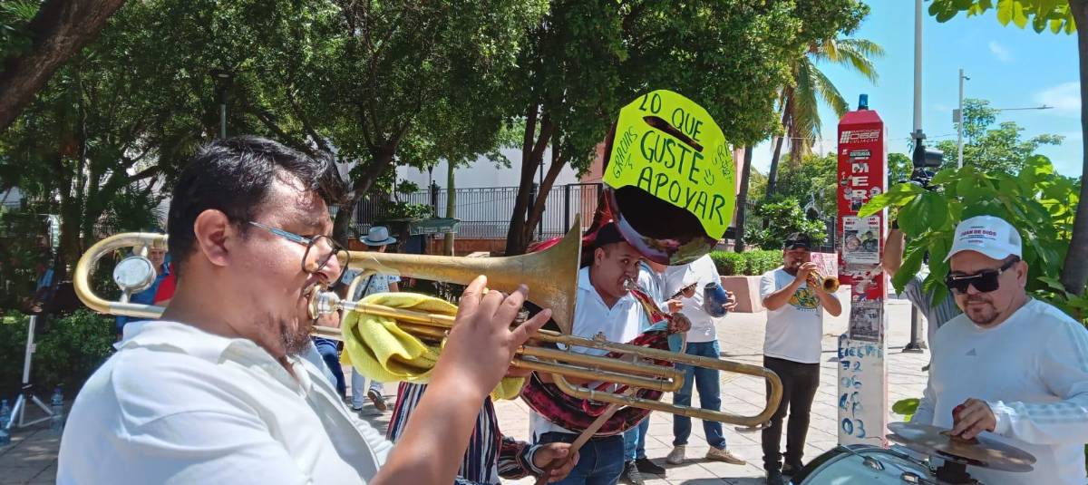 Este miércoles, músicos de diversas agrupaciones se concentraron en la Plazuela Álvaro Obregón, en el centro de Culiacán con instrumentos musicales para tocar canciones emblemáticas como “La Yaquesita” y una pancarta pegada a una tuba con la leyenda “Lo que guste apoyar”.