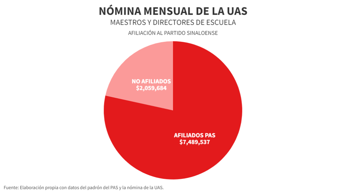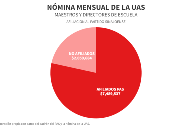 Un total de 650 maestros de asignatura de la Universidad Autónoma de Sinaloa con diversa carga de horas de trabajo se encuentran afiliados al Partido Sinaloense , lo que representa el 78 por ciento del total de esa plantilla y el 79 por ciento de la nómina; eso equivale a casi 3.5 millones de pesos mensuales, según un análisis de Noroeste que cruzó la nómina de la Universidad con el padrón del PAS.