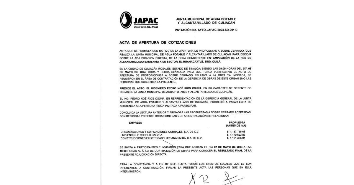En el documento menciona a dos empresas que también presentaron sus ofertas y que por razones presupuestales Japac no las pudo tomar, que fueron Luis Enrique Rodelo Galvez, con una inversión de un millón 170 mil 623.83 pesos.