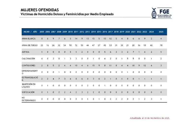 El uso de armas de fuego en asesinatos de mujeres en Sinaloa registró un incremento durante este 2025, de acuerdo con estadísticas oficiales de la Fiscalía General del Estado.