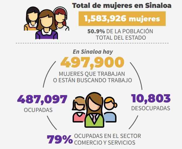 Con motivo el Día Internacional de la Mujer el Codesin desglosó la ocupación de la totalidad de las mujeres en la entidad; actualmente hay un millón 583 mil 926 mujeres en Sinaloa, de las cuales 497 mil 900 trabajan o buscan un empleo, 487 mil 097 están ocupadas; el 79 por ciento están ocupadas en los sectores del comercio y servicios y un total de 10 mil 803 están desocupadas.