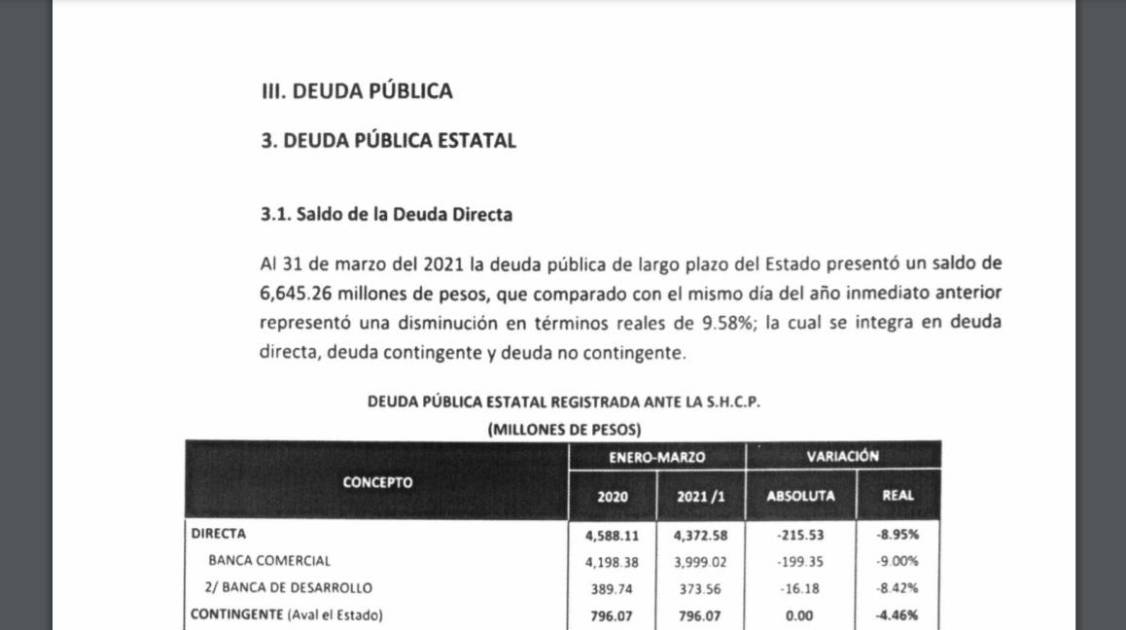 “El pago del servicio de la deuda directa de enero a marzo de 2021 fue de 98.26 millones de pesos, representando una variación real negativa de 34.91% respecto a lo pagado en el mismo periodo del año inmediato anterior”, dice el apartado 3.5. Costo Financiero de la Deuda Estatal Directa.